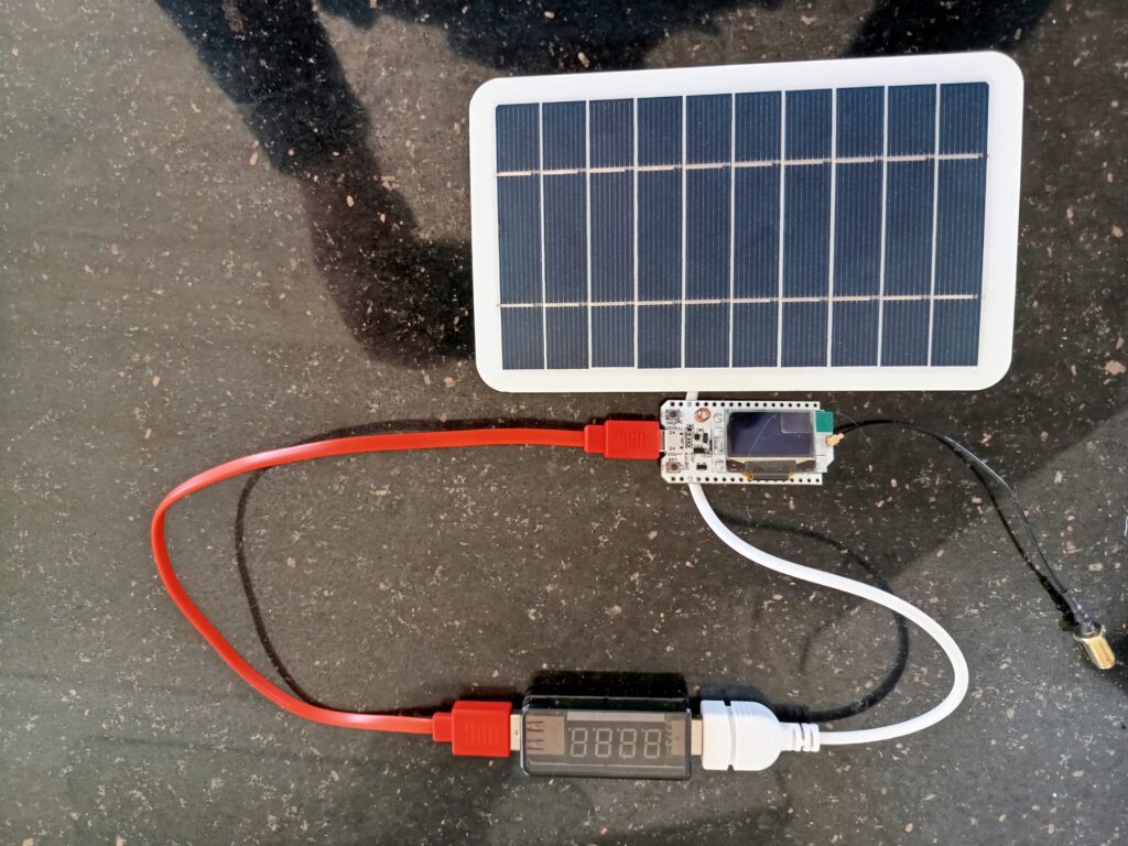 For å gjøre disse målingene brukte jeg et USB-amperemeter som måler strøm og spenning på en USB-forbindelse. Som forbruker av strømmen valgte jeg en liten mikrokontroller som trekker 90 mA ved normal drift. Dersom solcellene produserer mer enn 90 mA må jeg skifte til f.eks. en lampe. Bilder under viser måleoppstillingen.